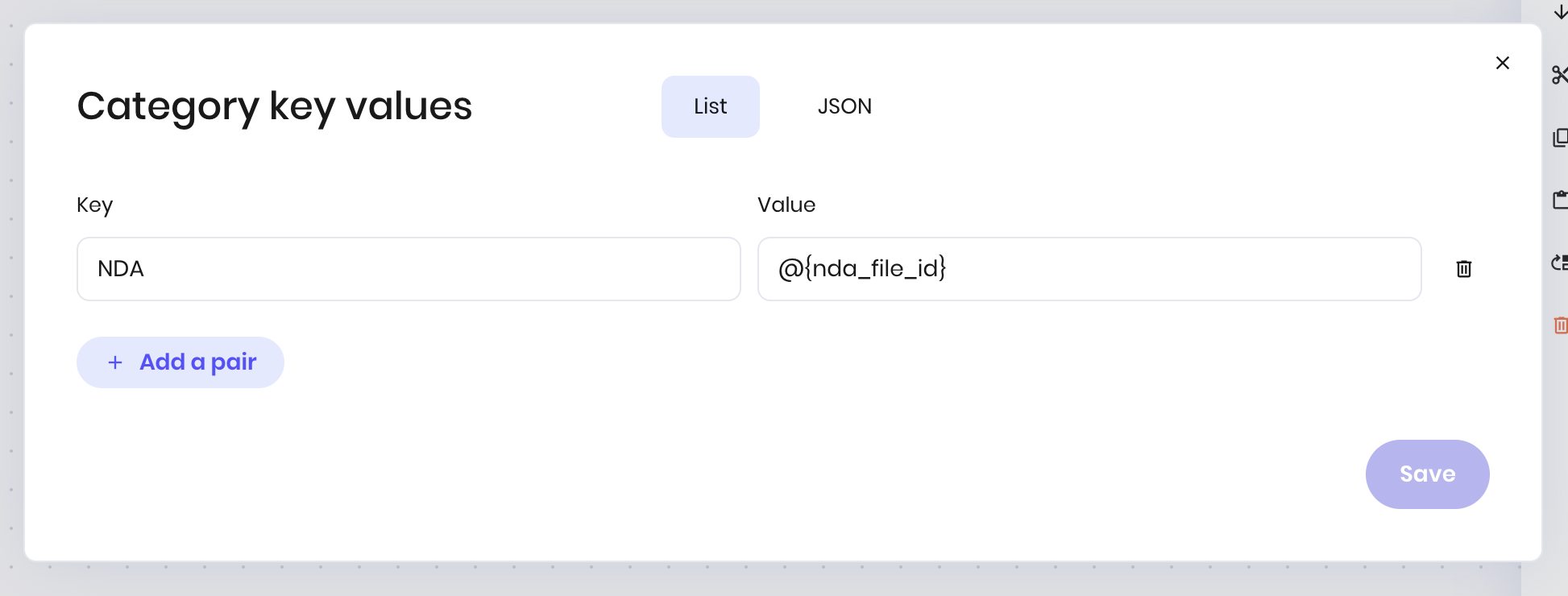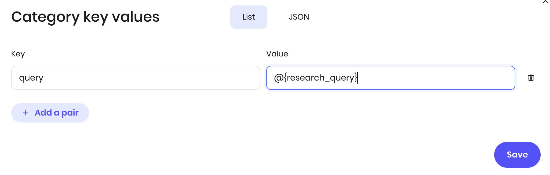 field. The inputs should match the inputs of the no-code agent you’re running. The key is the name of the input and the value is the value you’d like to pass to the agent.