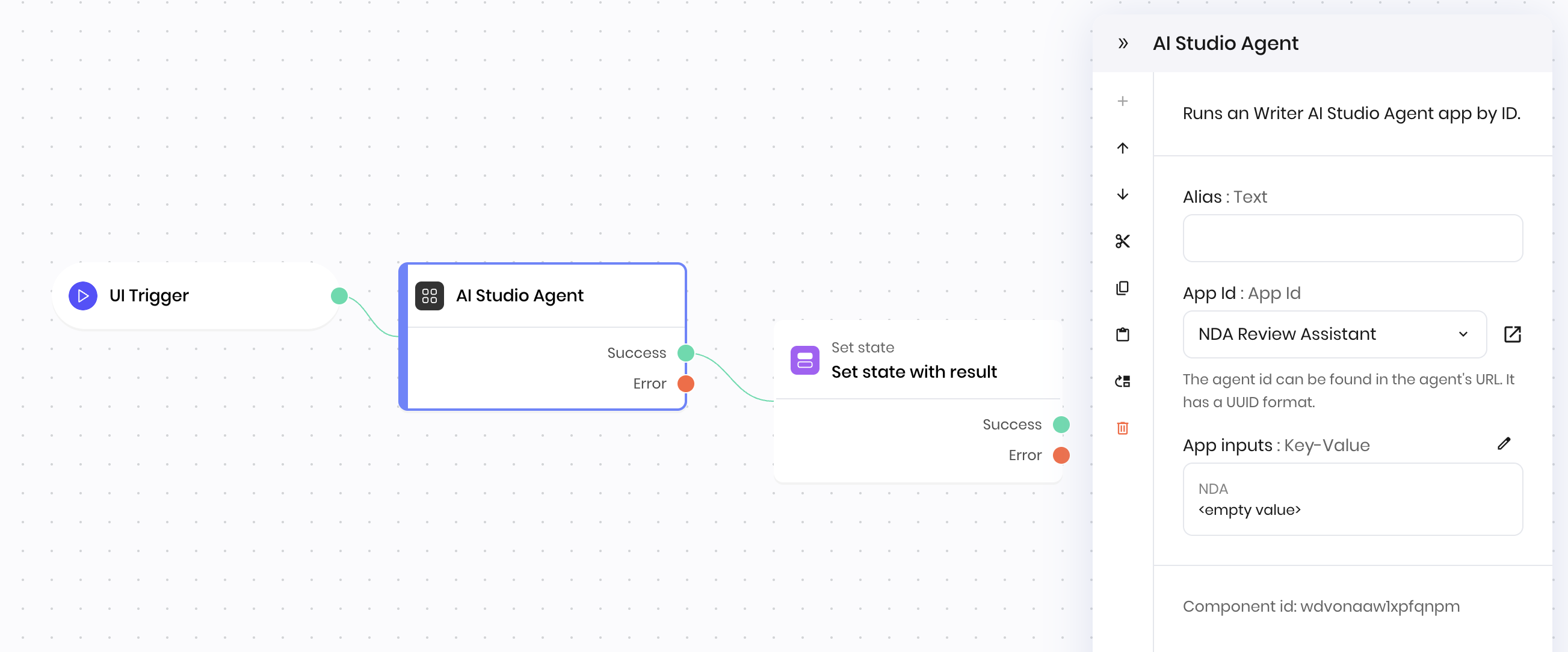 The following example shows an AI Studio Agent block that runs a no-code AI Studio agent.