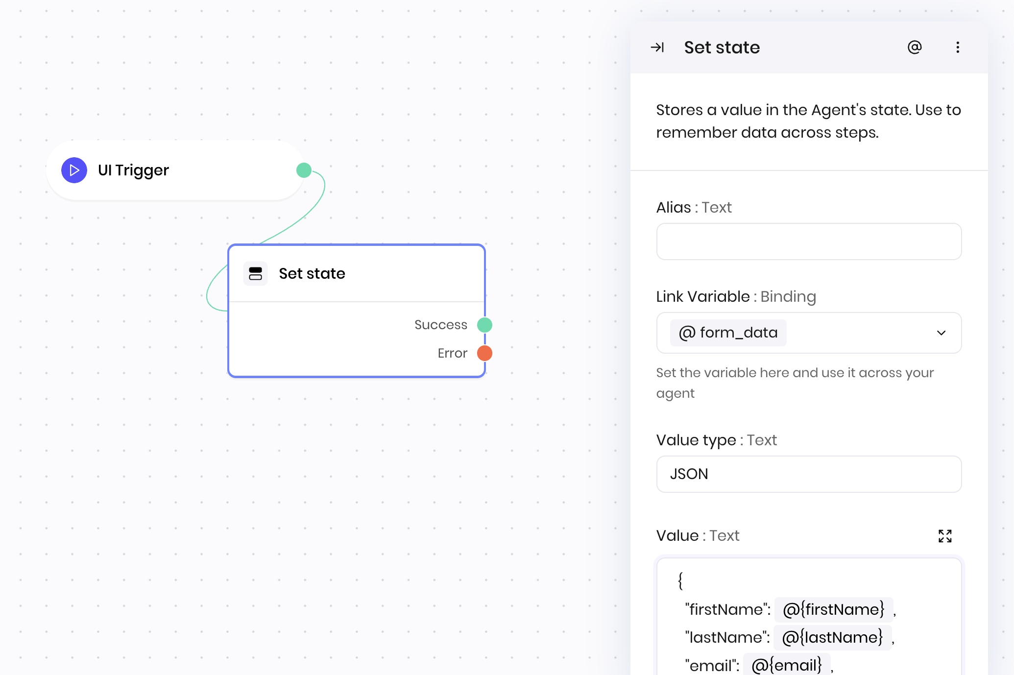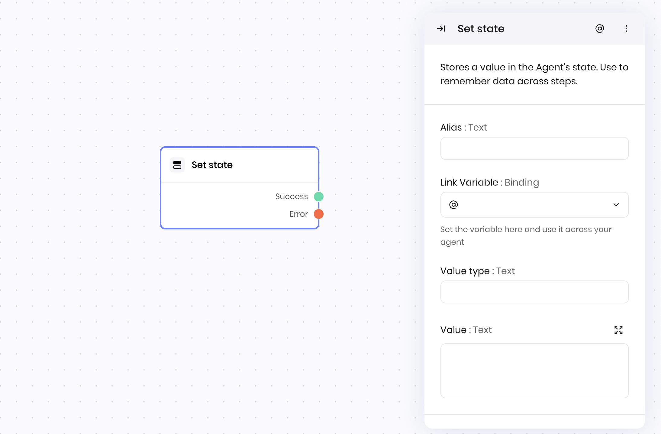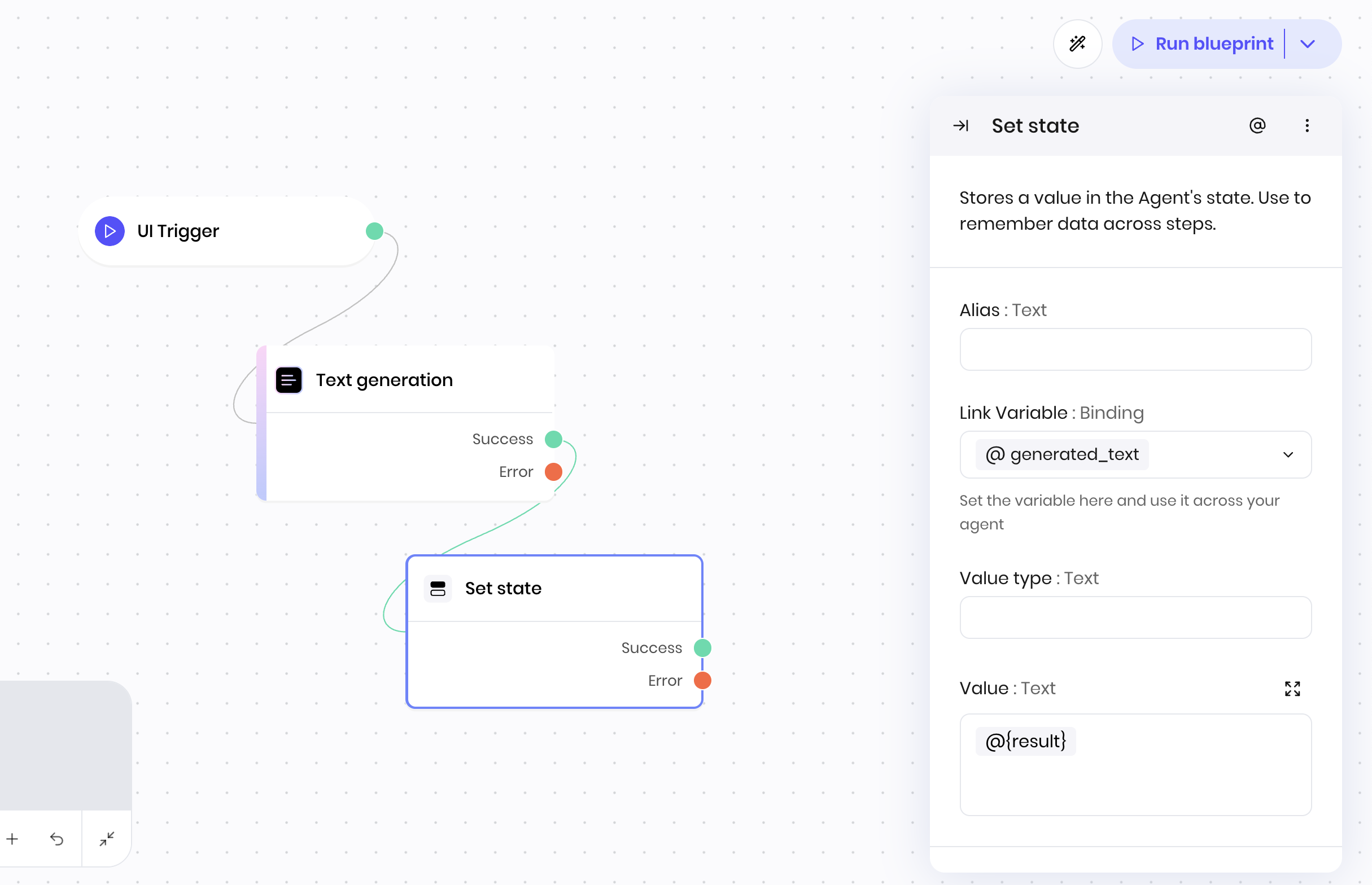 The Set state block is a core building block that connects information between different parts of your blueprint, interface, and code. It acts as a bridge, allowing data to flow from one part of your workflow to another - whether that’s from blueprint to interface, between different blueprint blocks, from interface back to blueprint, or to and from custom Python code.