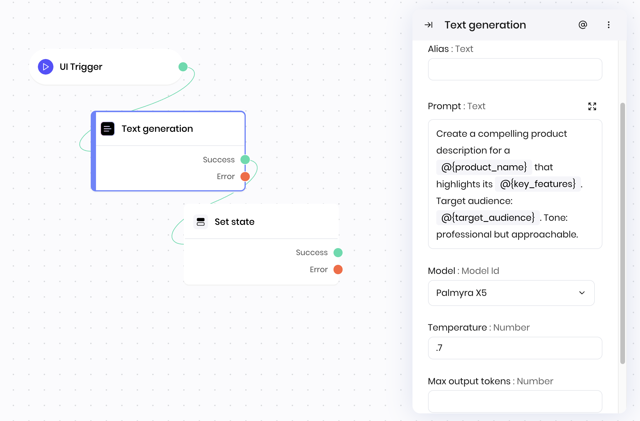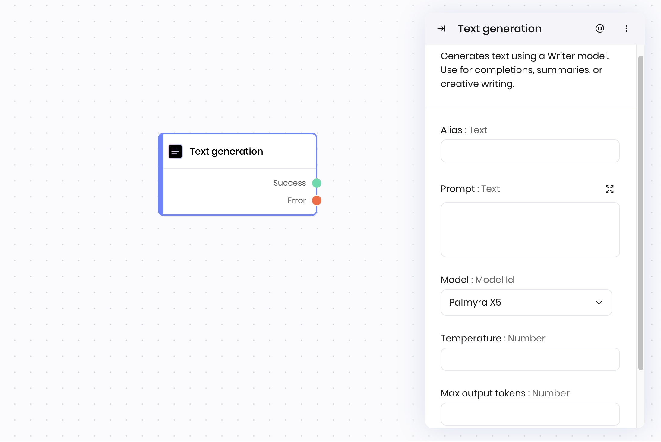 The Text generation block generates text using a Palmyra model. Use it for text completions, summaries, creative writing, and more. You provide a prompt, and the model generates a response based on your instructions. You can control the creativity of the output using the temperature setting, and limit the length with the max output tokens field.Common use cases