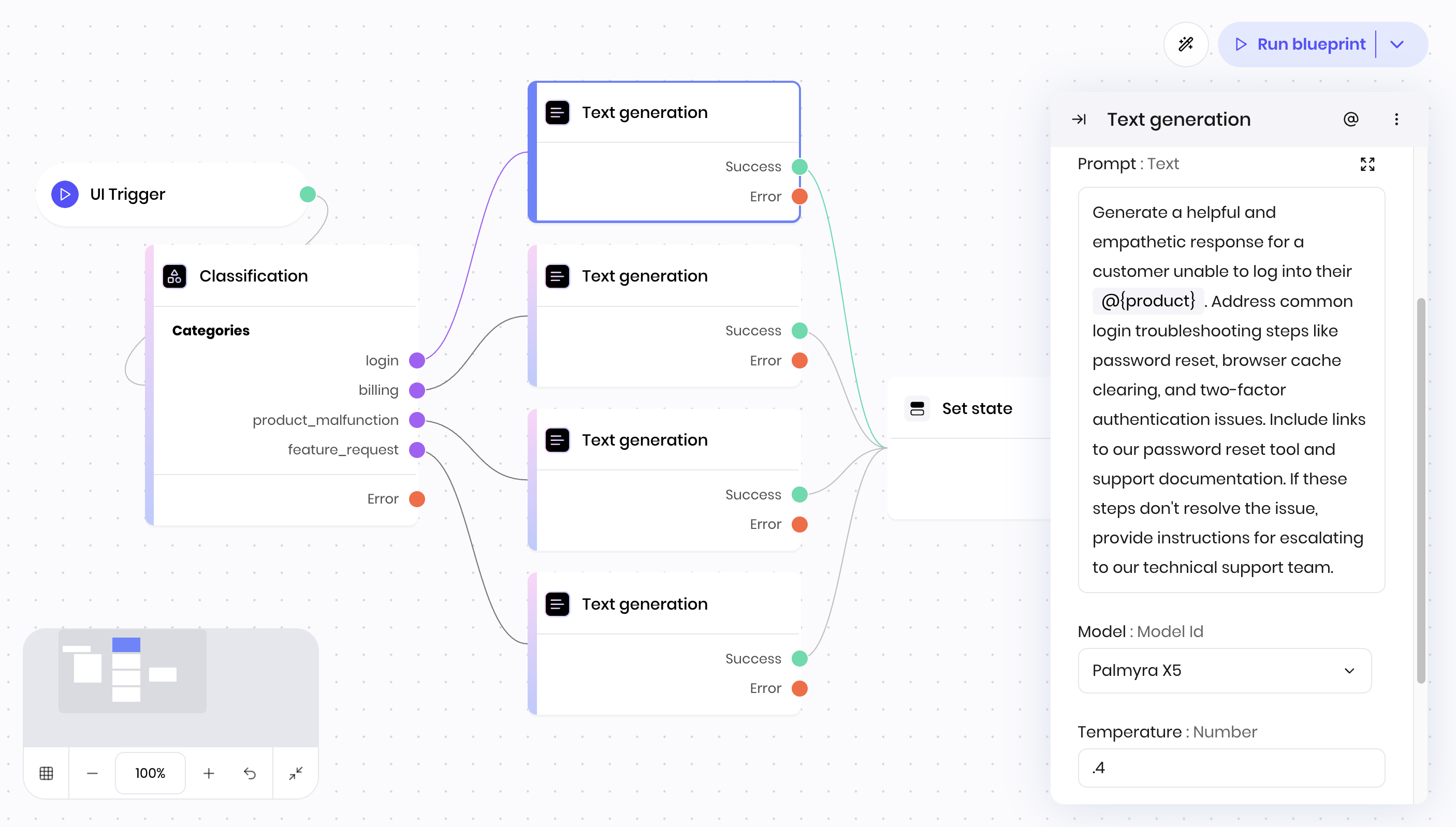 This example demonstrates an automated support system that generates personalized responses based on customer inquiries. Blueprint Flow:- UI Trigger → Customer submits support ticket