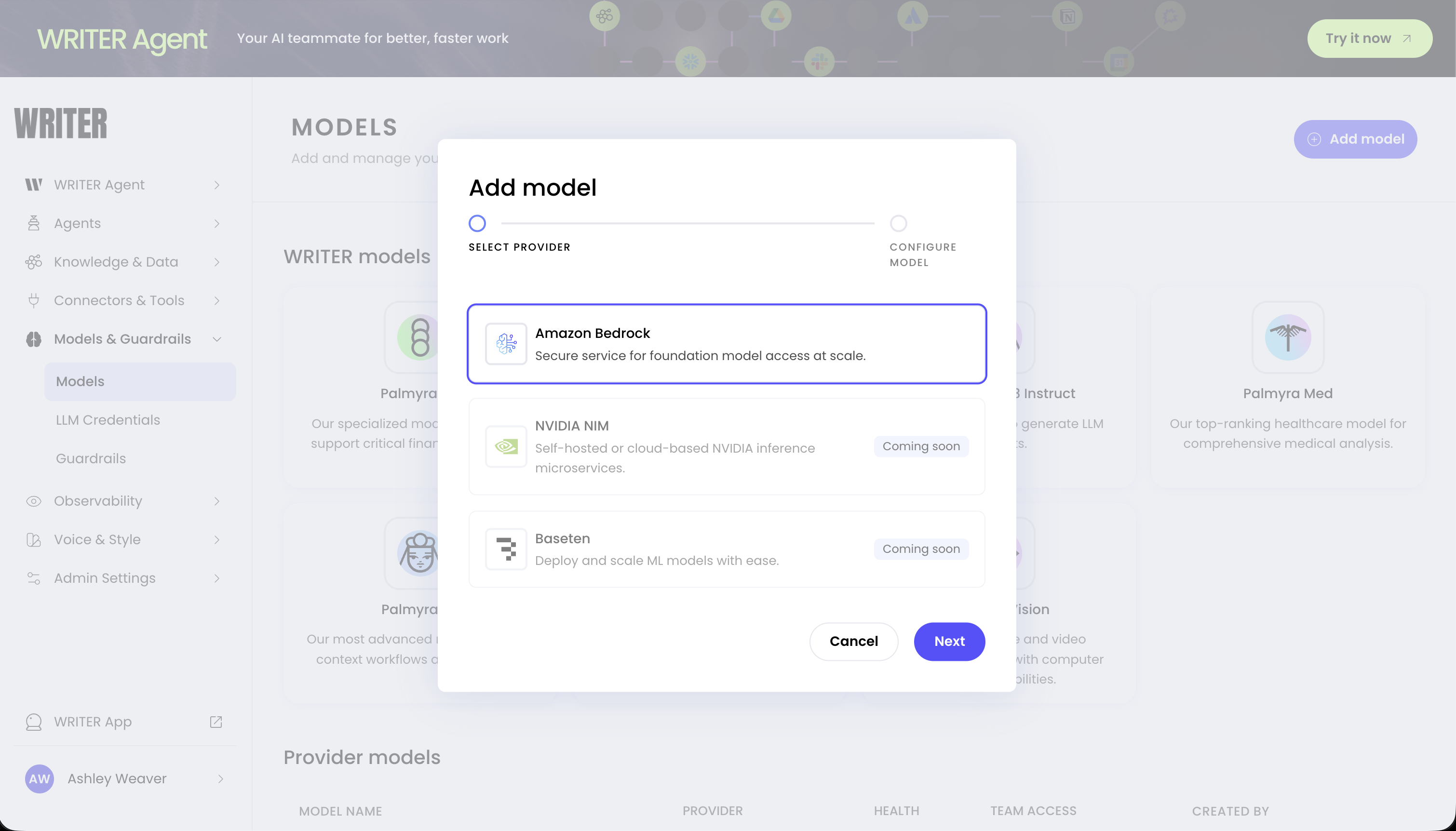 - Palmyra models: Explore Writer’s Palmyra model capabilities