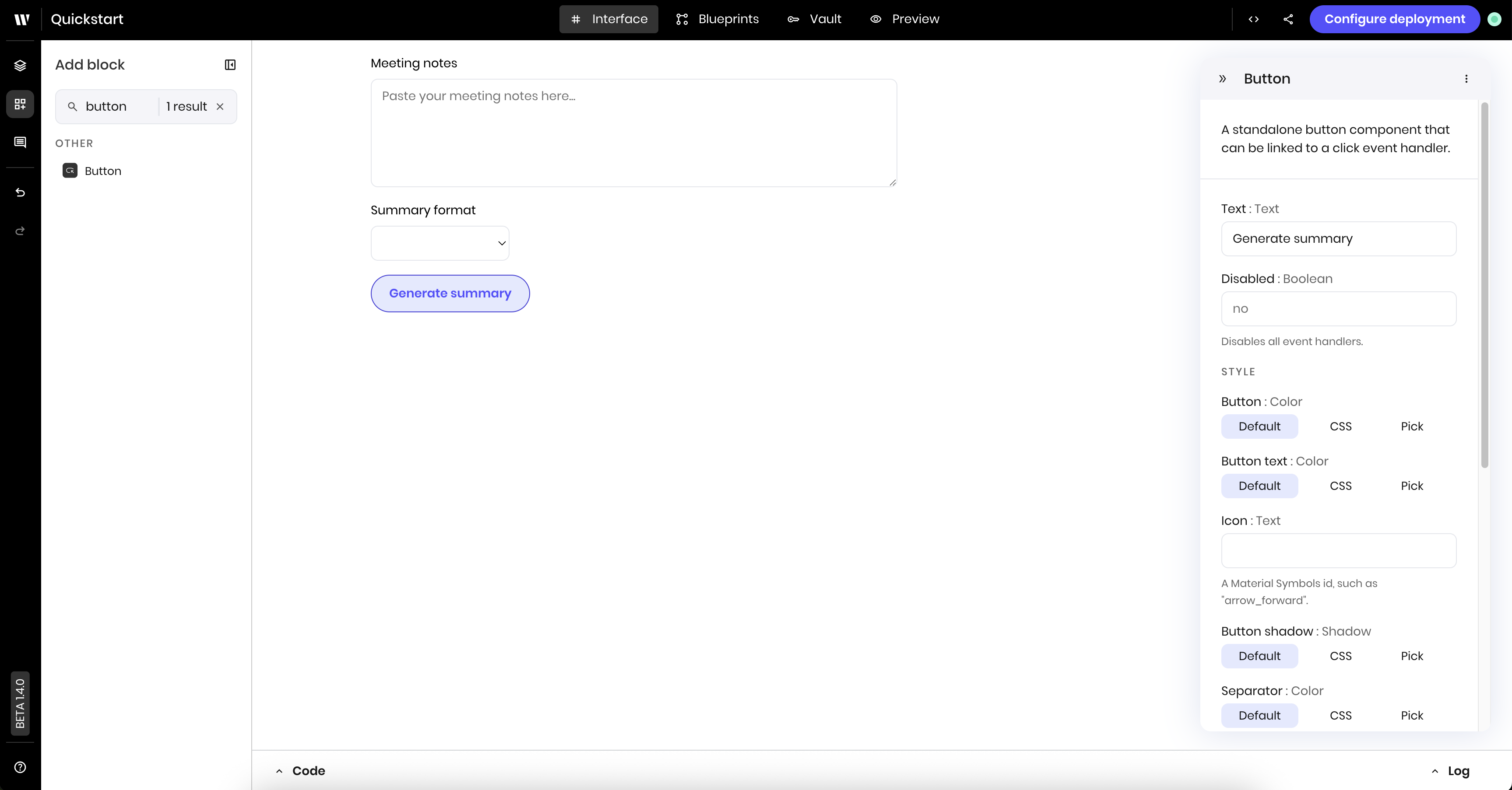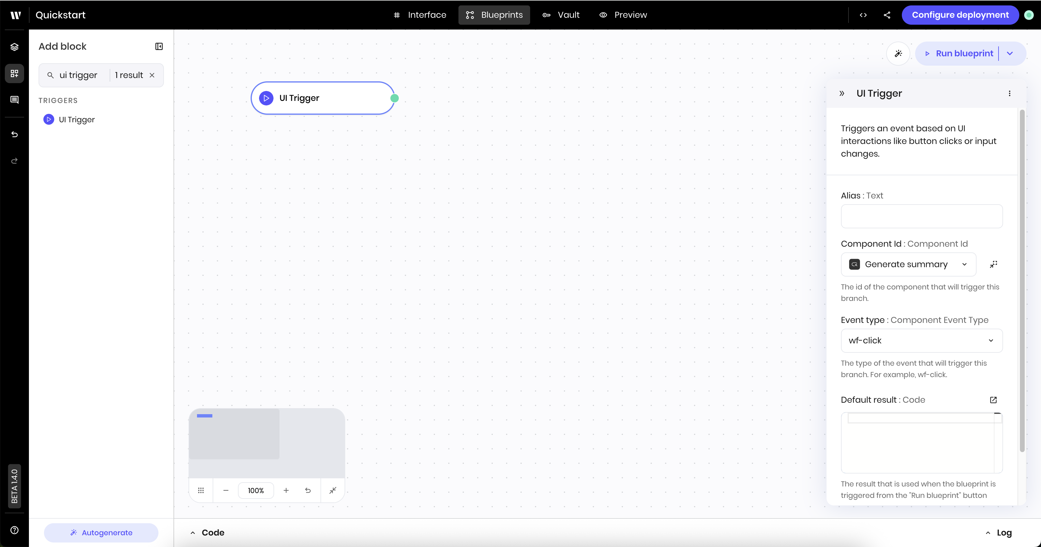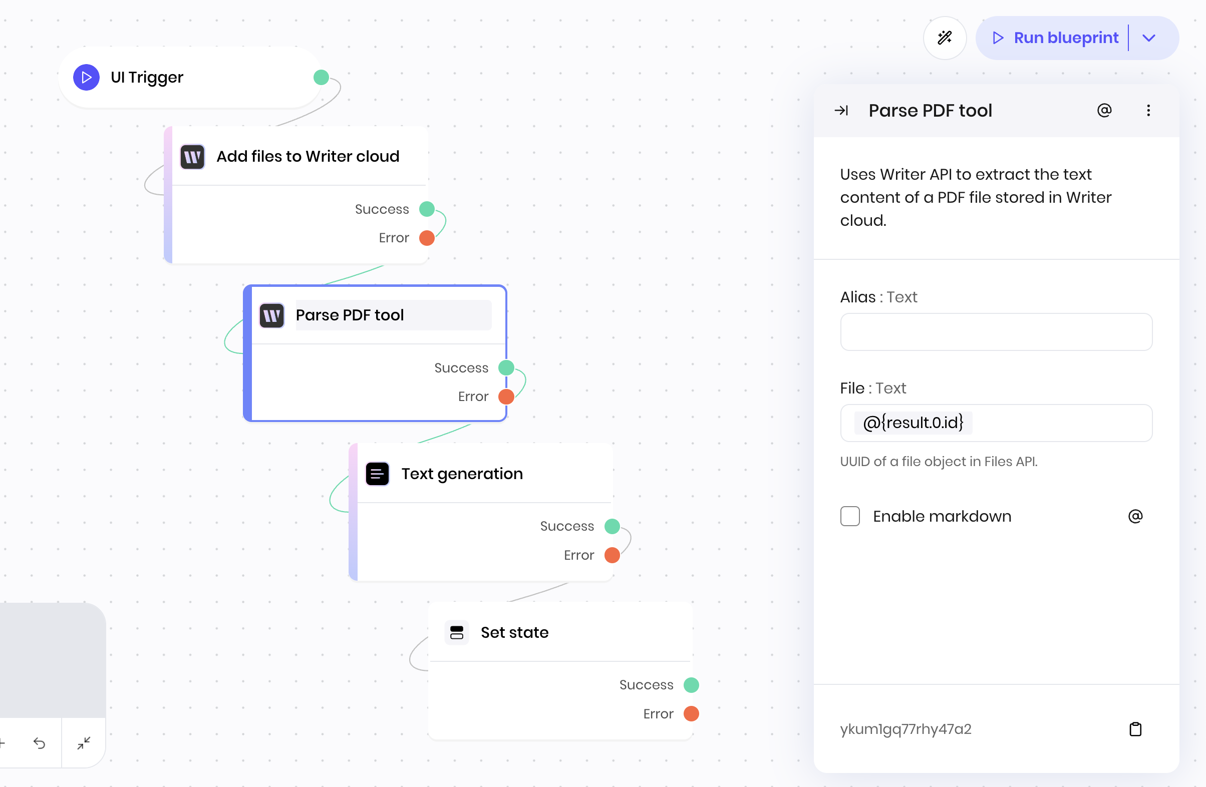 To run the blueprint without a UI Trigger, press the **Run blueprint** button in the top right of the blueprint.