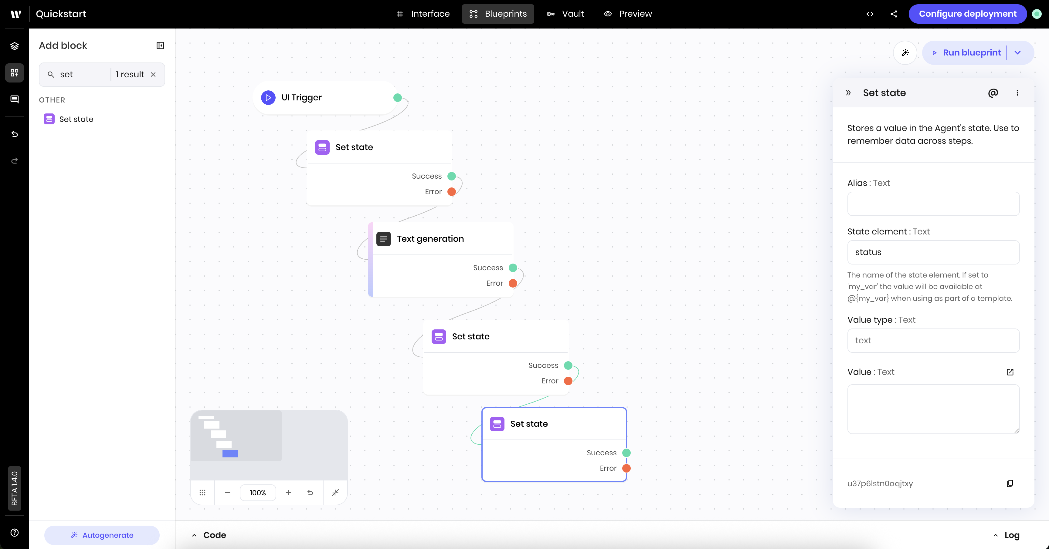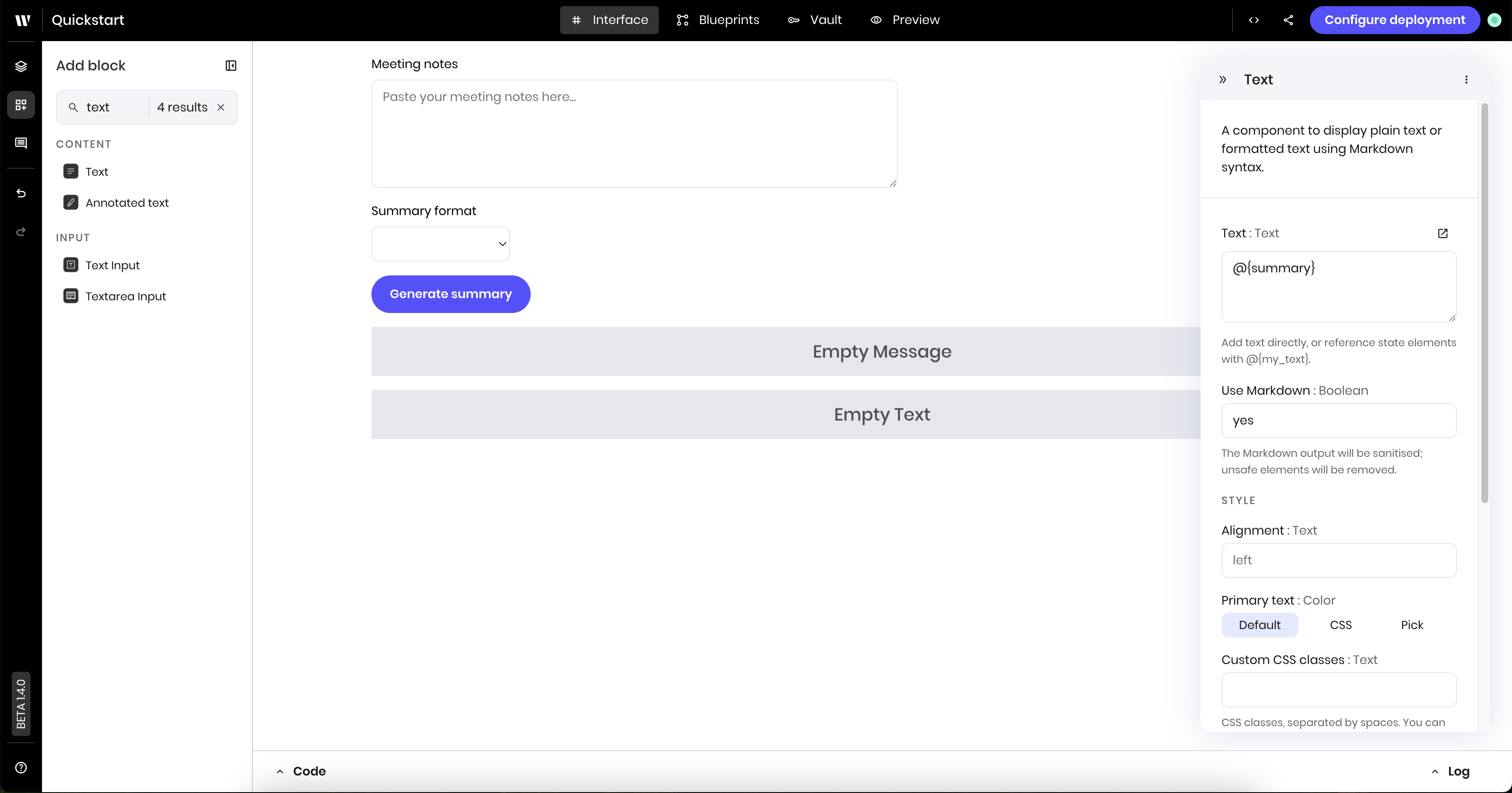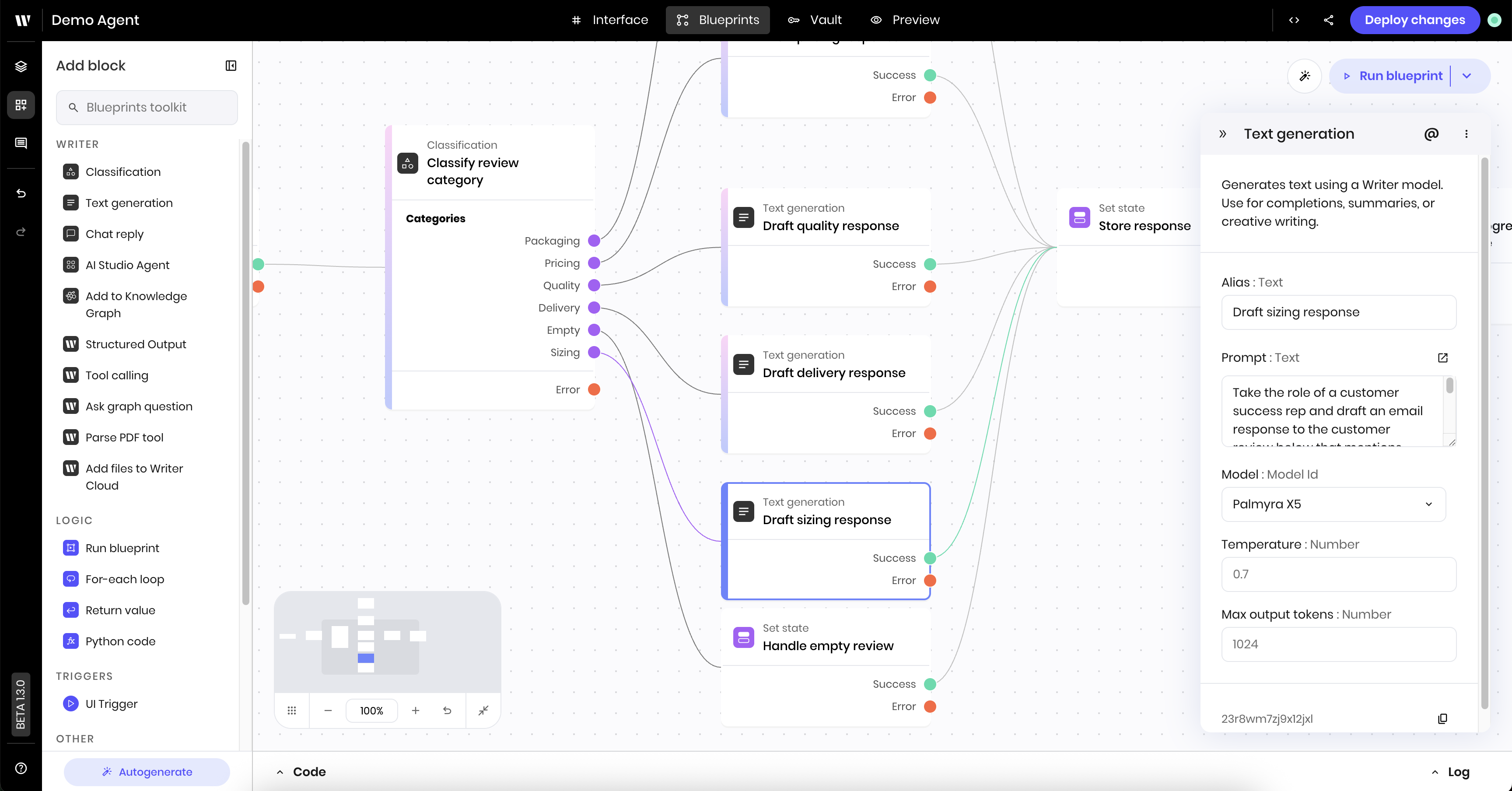 * Blueprints are created using a library of configurable blocks for tool calling, built-in RAG, text generation, classification, state management, and more.