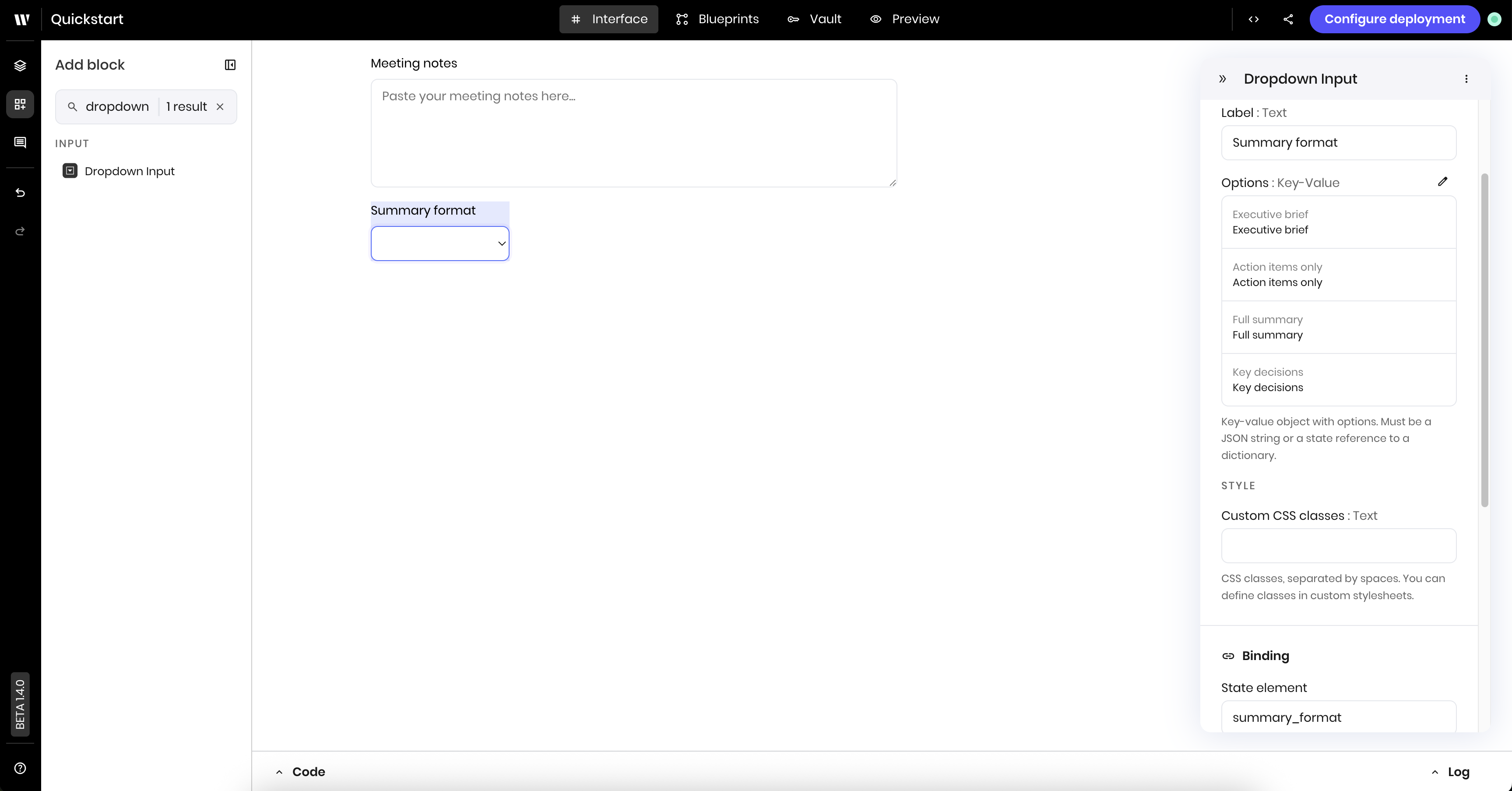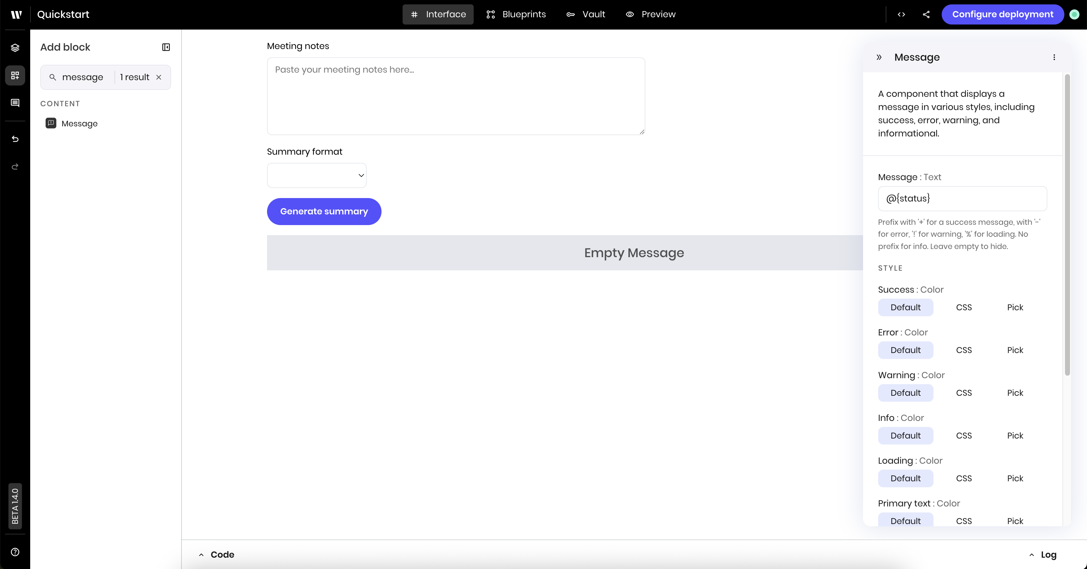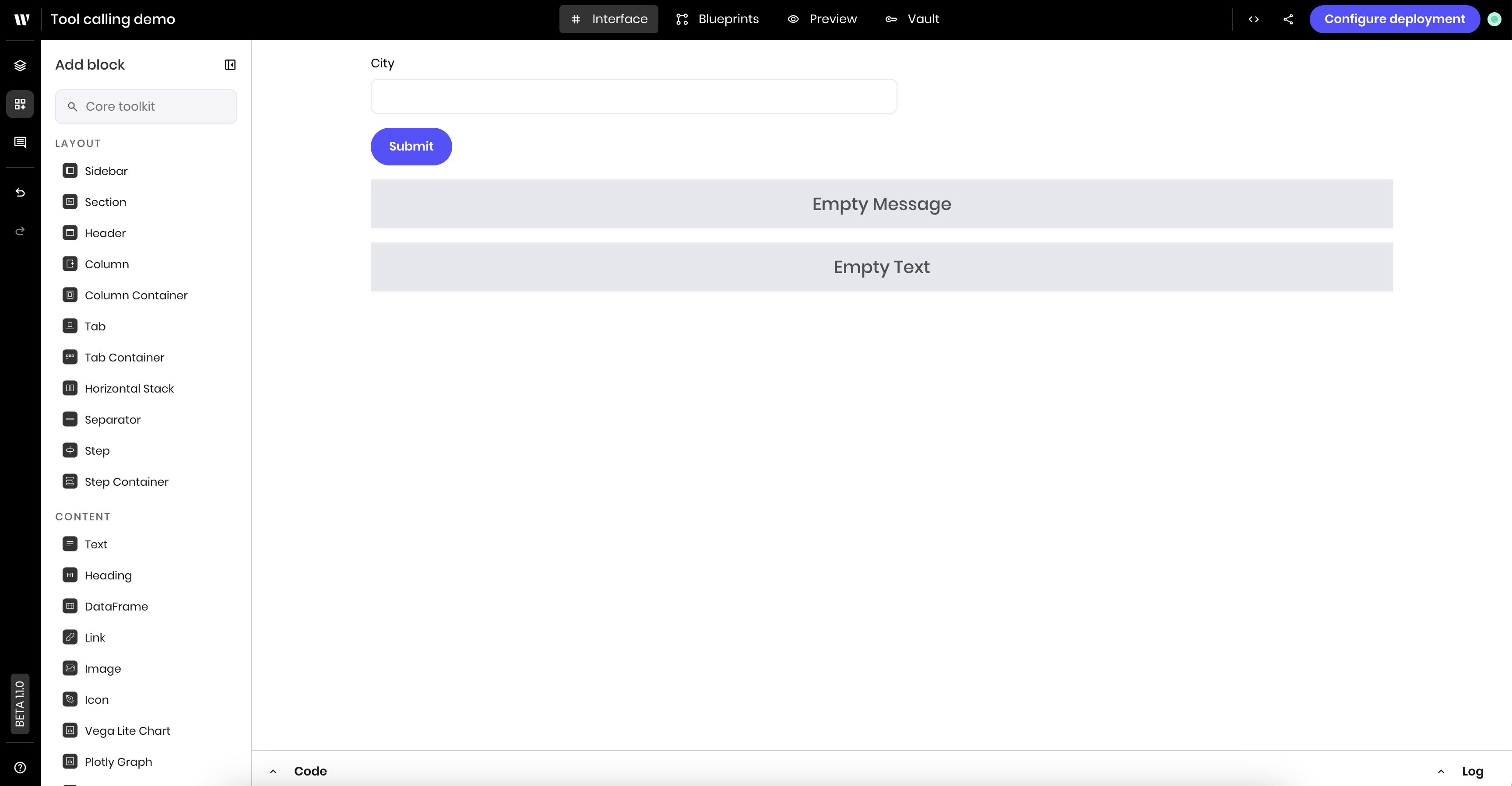 * Blueprints are created using a library of configurable blocks for tool calling, built-in RAG, text generation, classification, state management, and more.