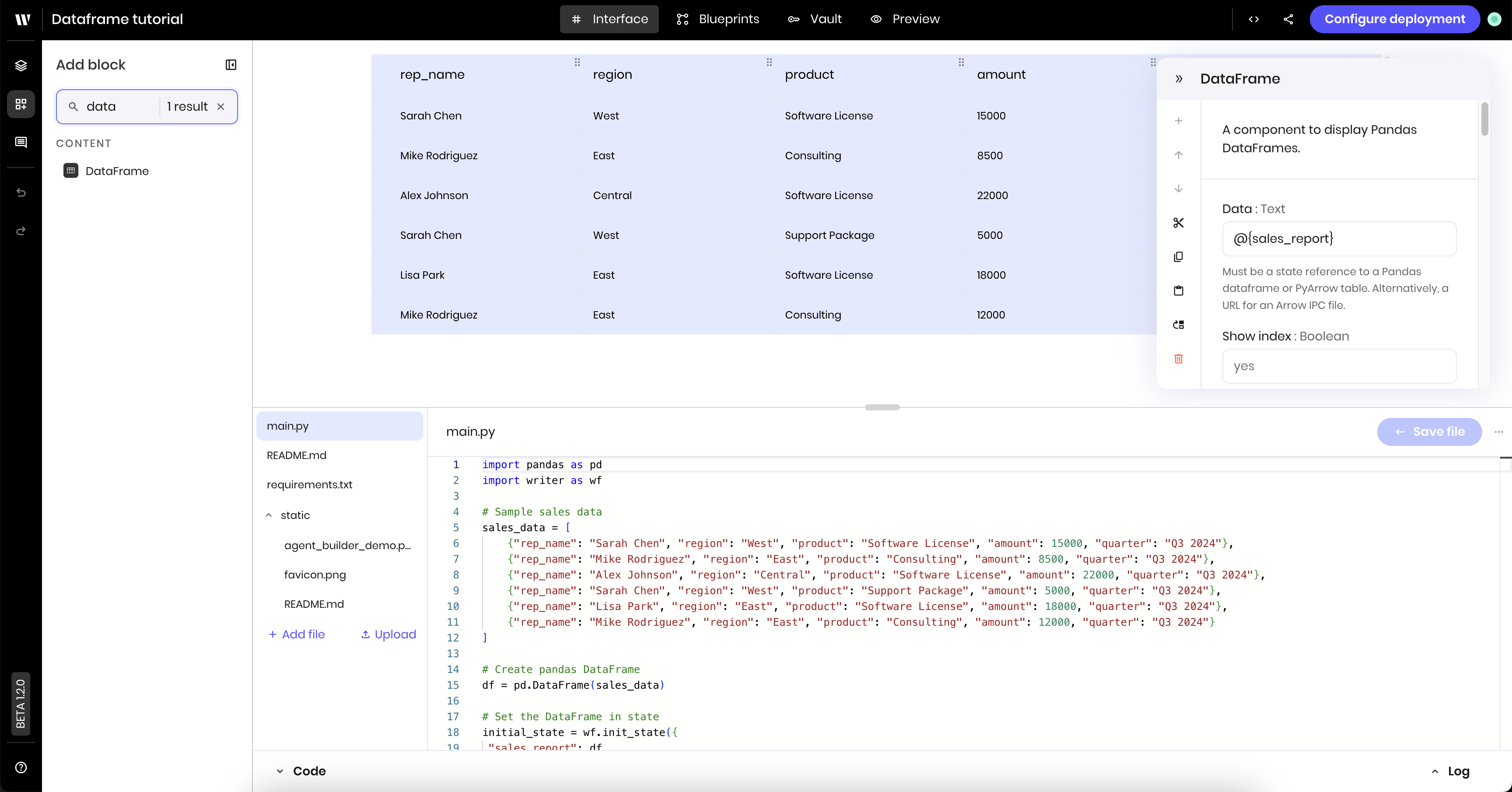 * A **Python** block that processes the uploaded file and stores the data in a state variable.